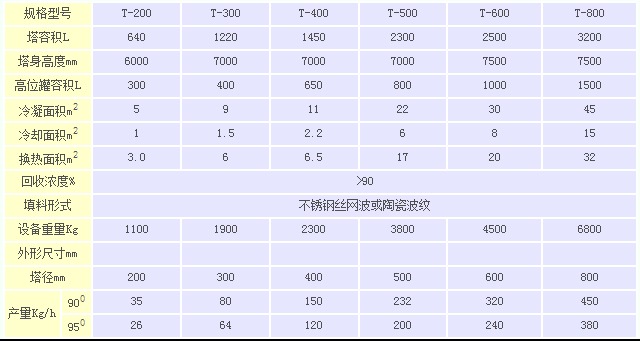 產品用途:本裝置適用于制藥、食品、輕工化工等行業(yè)的稀酒精回收。也適用于甲醇等其它溶媒的蒸餾。本裝置根據用戶的要求,可將30%左右的稀酒精蒸餾至90度—95度酒精、成品酒精,度數要求再高,可加大回流比,單產量就相應減少。